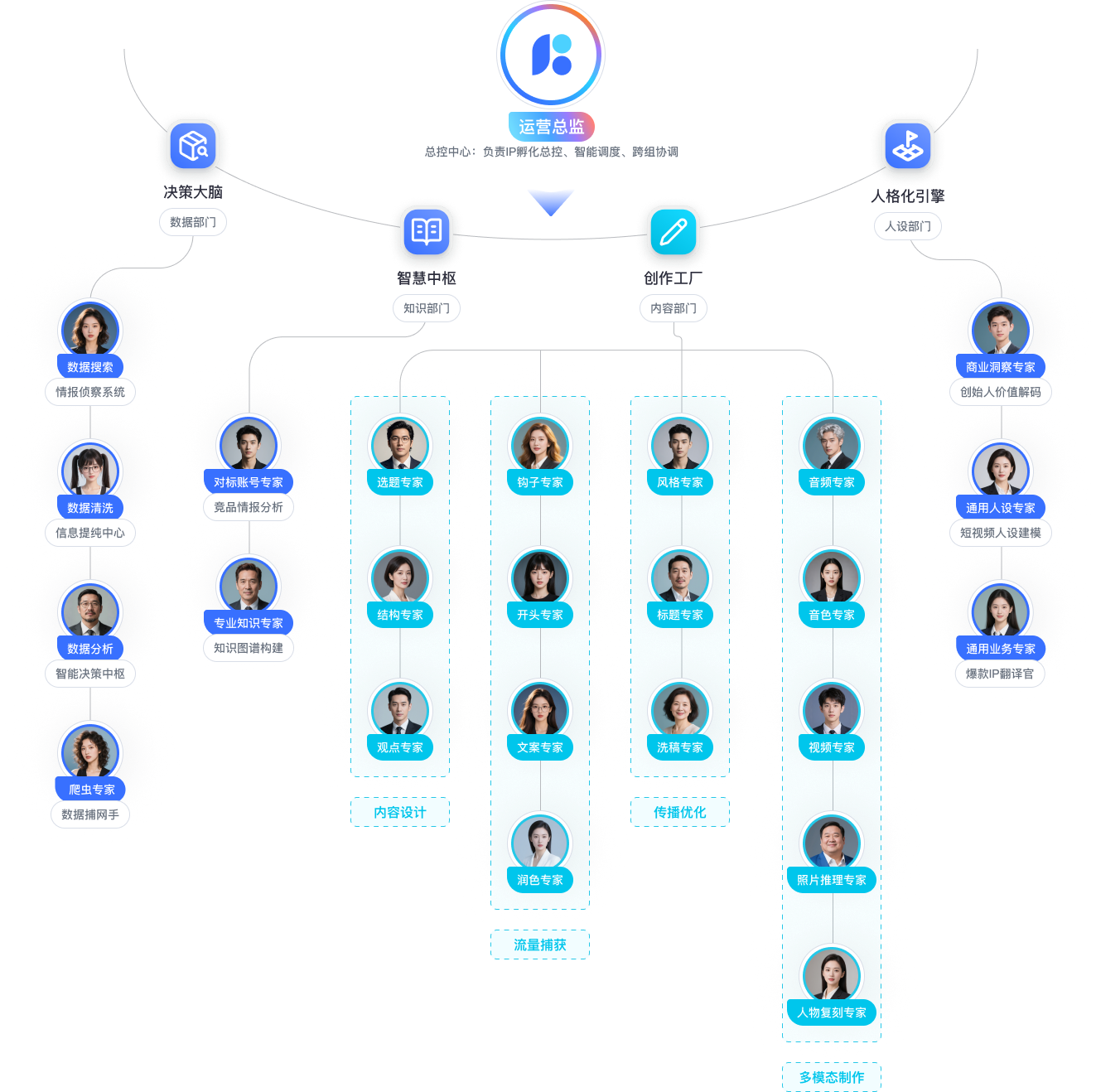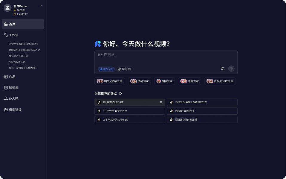 一站式短视频创作国内首个使用multi-agent,25位数字员工,7*24小时随时待命,支持一站式生成选题、文案、音频、视频,让短视频创作流程极简、高效